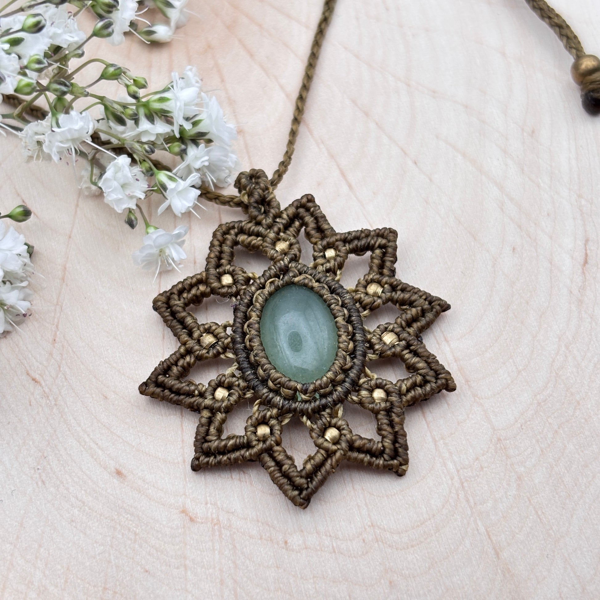Halskette mit eingefasstem Aventurin Stein und Messingperlen. Durch den Schiebeverschluss ist die Kette grössenverstellbar.