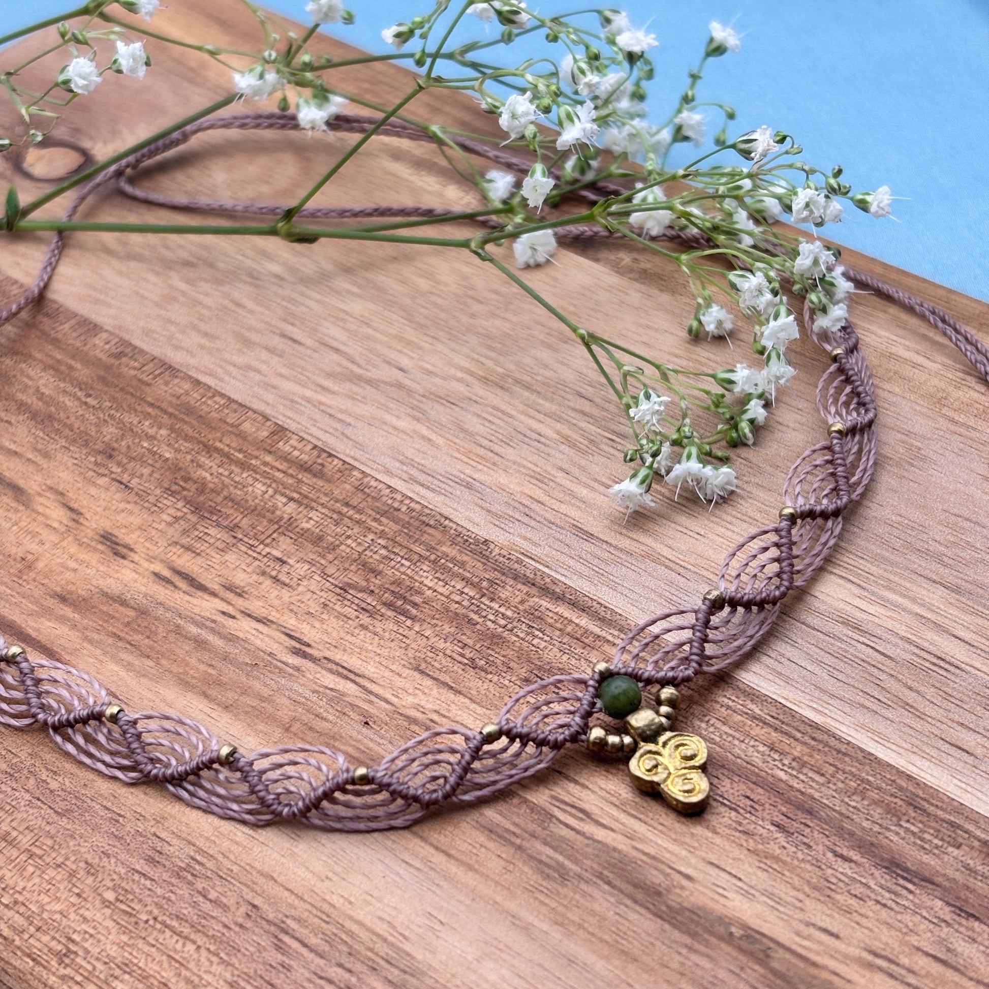Filigrane Halskette mit eingeknüpften Messing- und Serpentin Perlen.