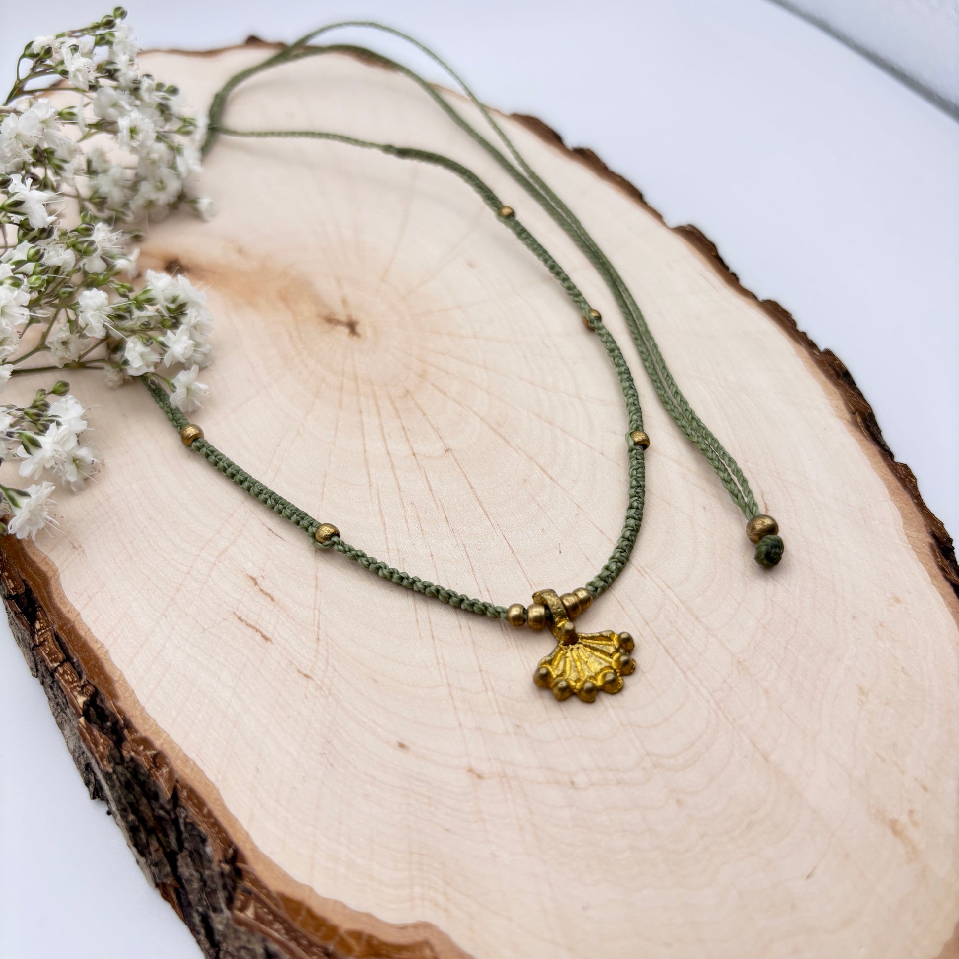 Fein geknüpfte Halskette ins Lindengrün mit Perlen und Anhänger aus Messing. Durch den Schiebeverschluss ist die Kette grössenverstellbar.