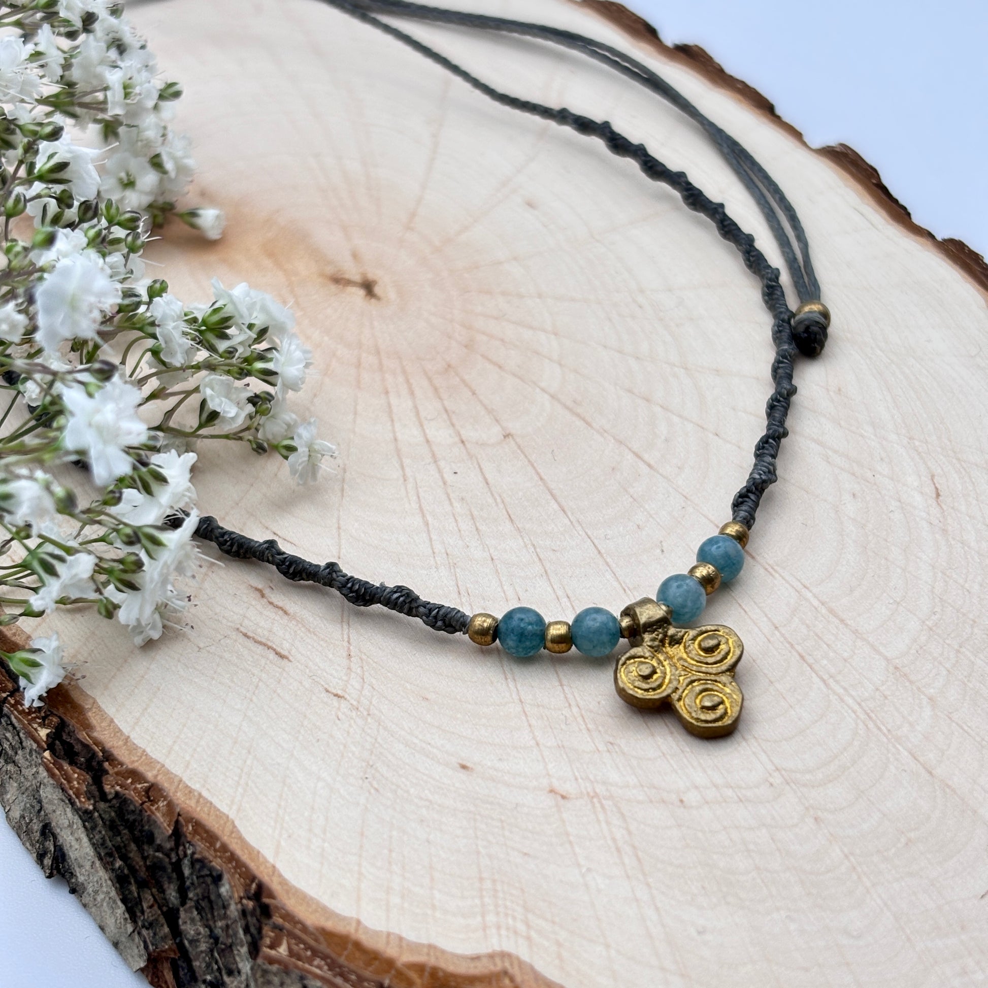 Feine Halskette mit Messinganhänger und Apathit Perlen. Durch den Schiebeverschluss ist die Kette grössenverstellbar.